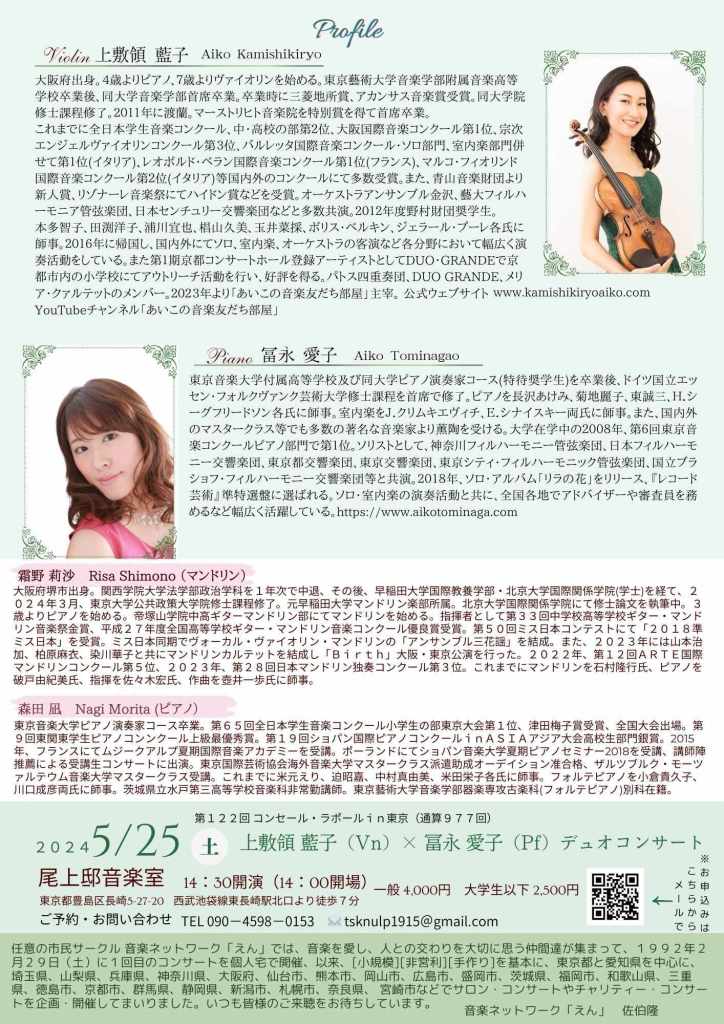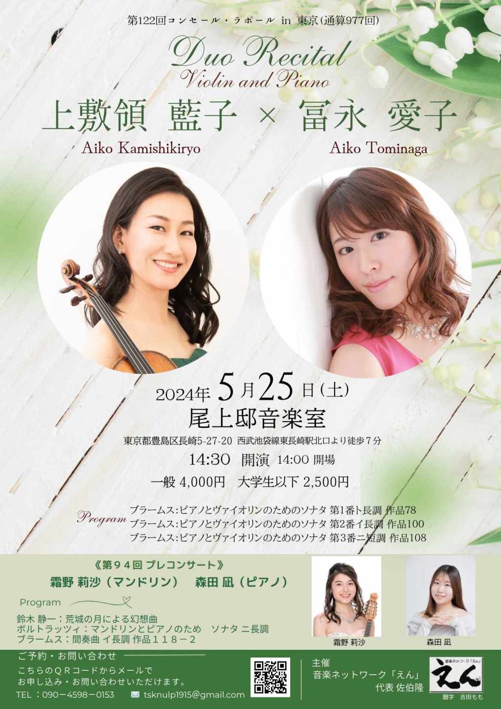 『冨永 愛子&上敷領 藍子 デュオ・リサイタル』 ~ブラームスのピアノとヴァイオリンのためのソナタ全3曲演奏会~