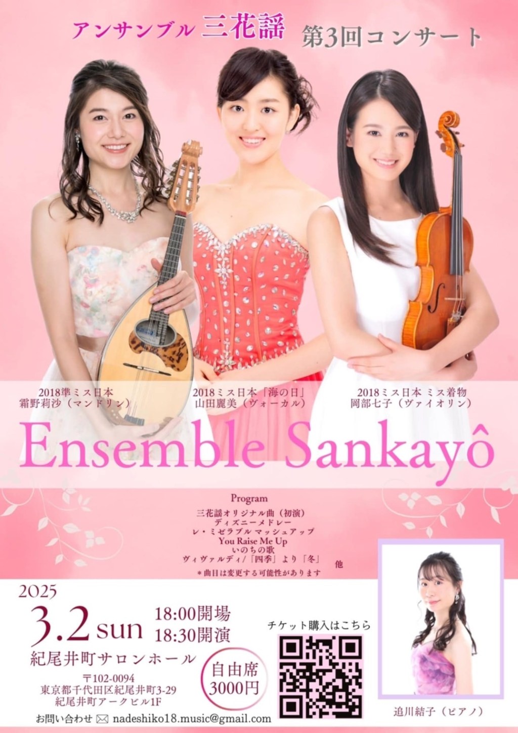 2018ミス日本の同期3人で活動している歌・ヴァイオリン・マンドリンの「アンサンブル三花謡」が3年ぶりに3回目の自主公演を開催します!